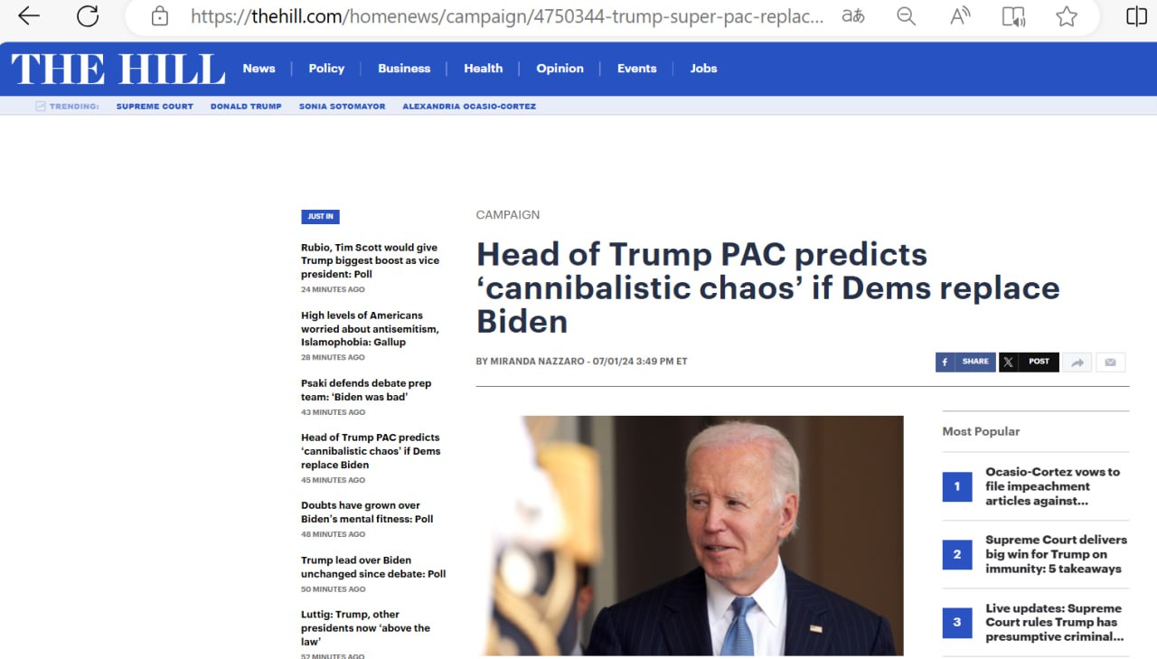 «В конце концов, для демократов единственное, что может быть хуже, чем идти в день выборов с Джо Байденом в билете, — это когда Джо Байден оставляет билет и беспомощно наблюдает, как их партия поглощена каннибальским хаосом, который, несомненно, последует», — добавил он позже.