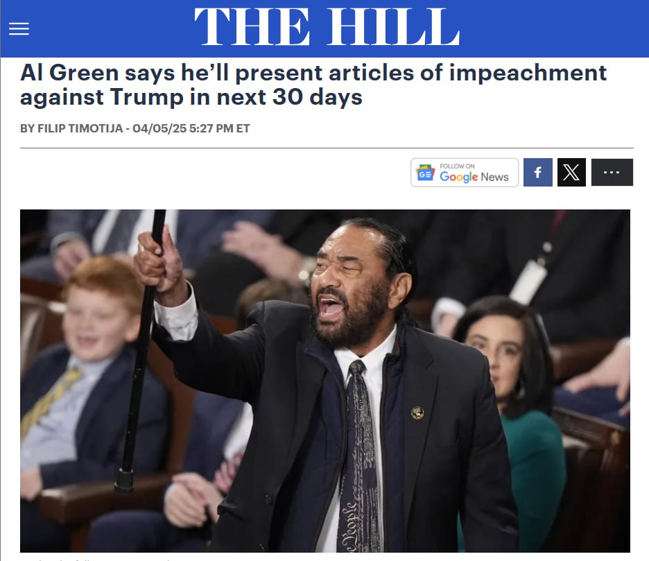 О таком намерении заявил конгрессмен-демократ Эл Грин. По его мнению, Дональд Трамп не заслуживает занимать должность президента Штатов.