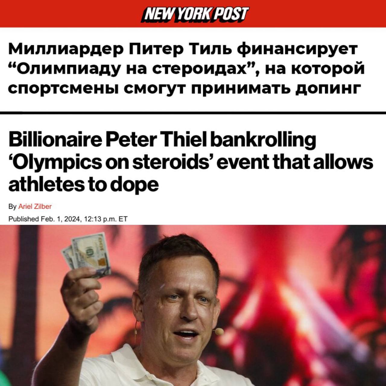Сооснователь PayPal Питер Тиль профинансирует соревнования Enhanced Games, где спортсмены смогут принимать допинг.