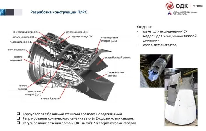Поскольку «Сухой» «сопротивлялся изменениям в самом планере», разработчикам двигателя пришлось «придумать довольно сложную плоскую сопловую насадку».