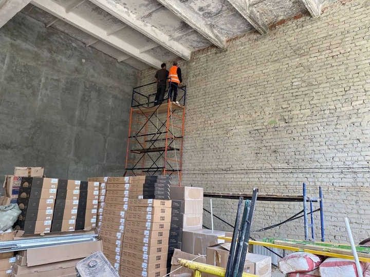 «В здании была демонтирована кровля и инженерные системы, разобраны пол, стены, потолки в помещениях и актовом зале, после чего рабочие приступили к восстановлению. Сейчас в помещениях выполняются работы по обшивке стен и потолков гипсокартоном, оштукатуриванию и шпаклевке. Ведется монтаж слаботочных систем», — рассказали в департаменте.