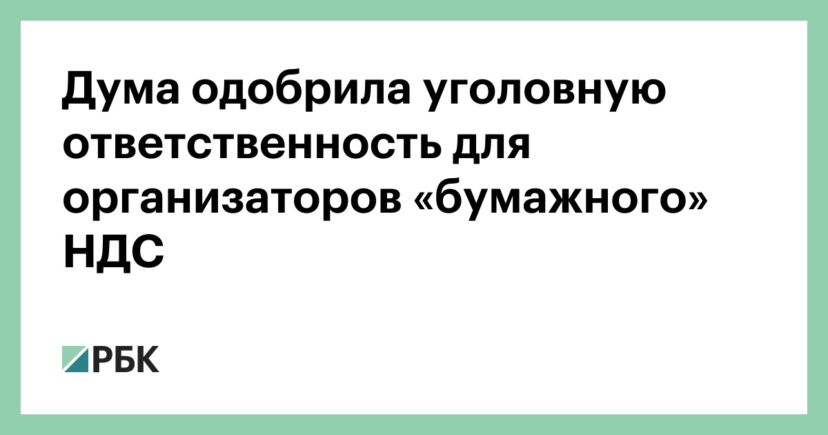 Госдума одобрила во втором и третьем чтении законопроект, вводящий уголовную ответственность для организаторов схем с «бумажным» НДС — то есть злоумышленников, которые используют фирмы-однодневки для продажи недобросовестным налогоплательщикам фиктивных счетов-фактур с целью подтверждения налоговых вычетов такими налогоплательщиками. При фиктивной покупке сделка осуществляется только «на бумаге», товары не отгружаются и не оплачиваются, но вычет так называемого «входящего» НДС (налога, включенного в стоимость приобретаемых товаров) оформляется — тем самым занижается налоговая база.