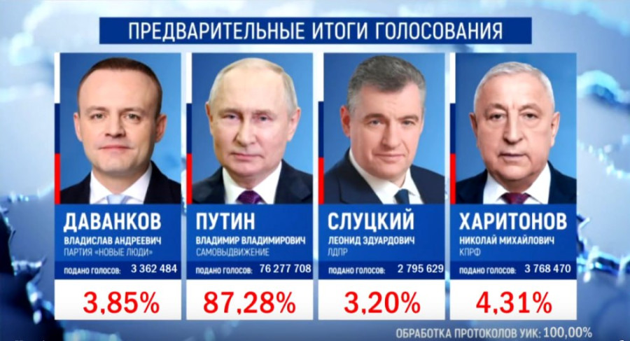 На четвёртом месте лидер ЛДПР Леонид Слуцкий с 3,2% голосов избирателей.