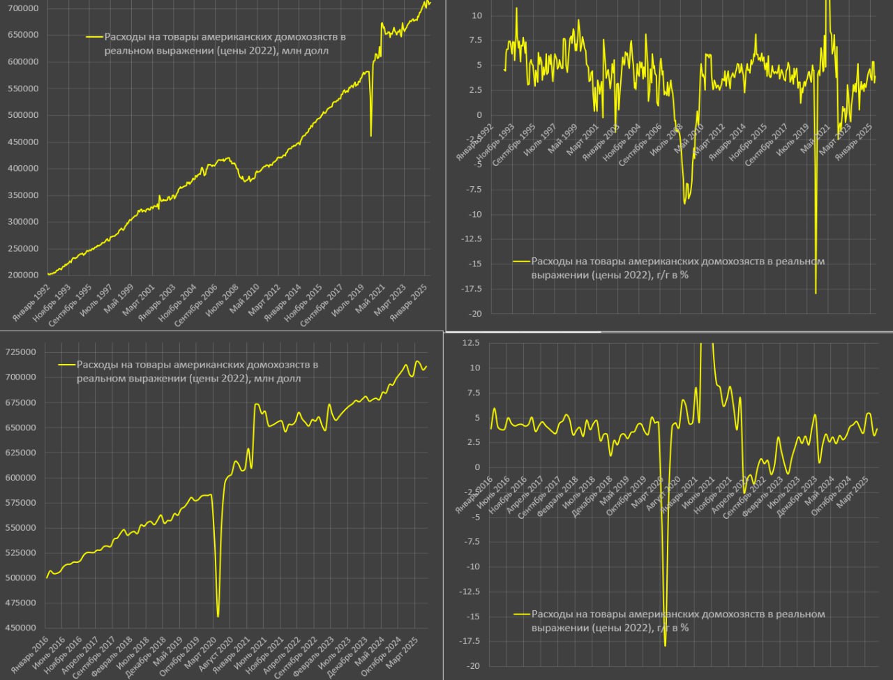 Если сравнить период Трампа (февраль-июнь) рост на 4.3% г/г по номиналу и столько же в реальном выражении (учитываю дефлятор по товарам, где инфляция около нуля), но весь рост обусловлен экстремально сильными показателями в 2П24, когда среднемесячный рост достигал 0.64%, с начала 2025 – все очень плохо!