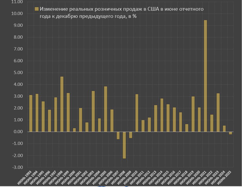 За последние полгода (июн.25 к дек.24) розничные продажи в США сократились на 0.21% в реальном выражении - последний раз так плохо было только в 2009, когда падение составило 0.53%.