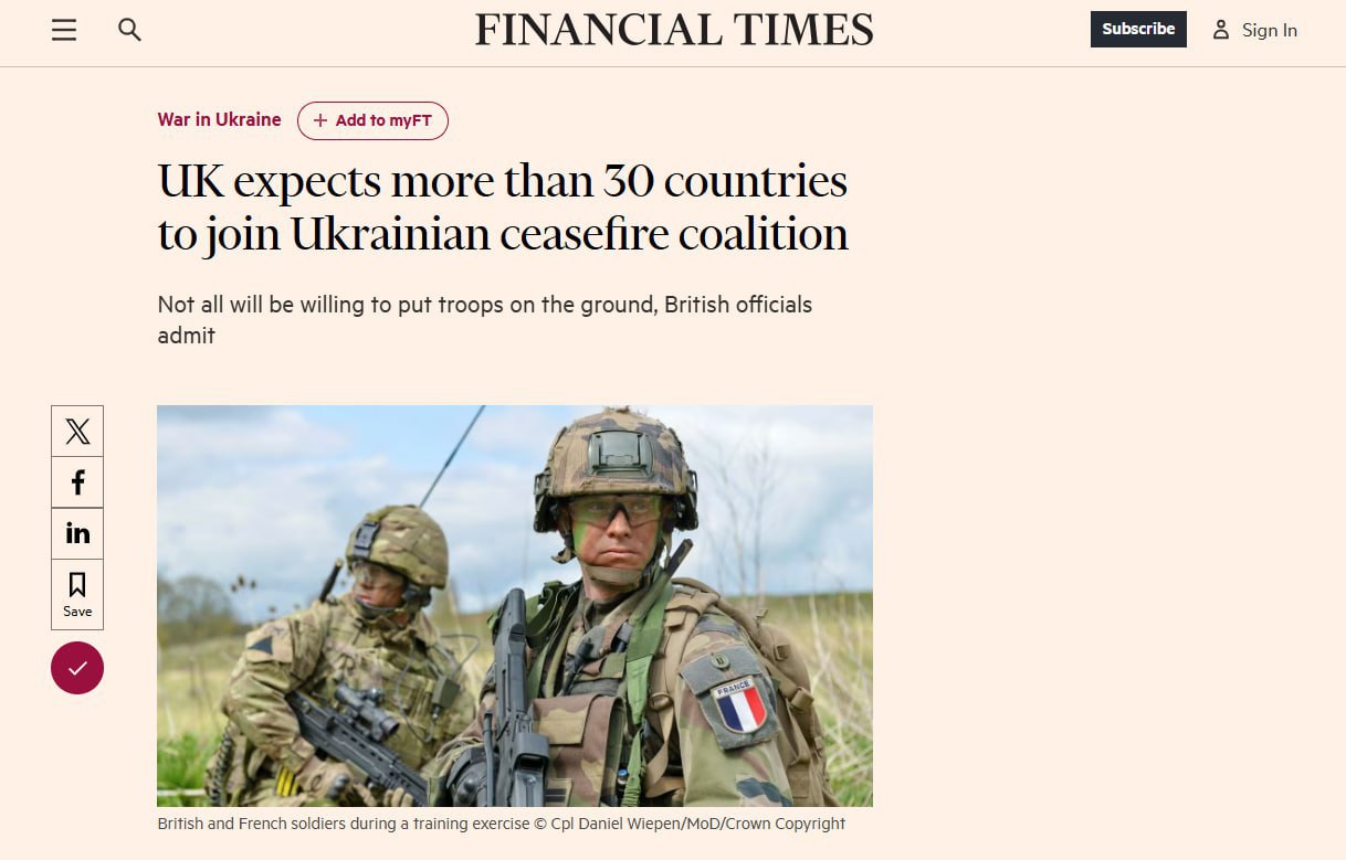 ΠΠΎ Π΄Π°Π½Π½ΡΠΌ Financial Times, ΠΡΠΈΡΠ°Π½ΠΈΡ, Π€ΡΠ°Π½ΡΠΈΡ ΠΈ ΠΠ²ΡΡΡΠ°Π»ΠΈΡ Π²ΡΡΠ°Π·ΠΈΠ»ΠΈ Π³ΠΎΡΠΎΠ²Π½ΠΎΡΡΡ Π½Π°ΠΏΡΠ°Π²ΠΈΡΡ Π²ΠΎΠ΅Π½Π½ΡΡ , ΠΎΠ΄Π½Π°ΠΊΠΎ ΠΏΠΎΠ΄ΡΠ΅ΡΠΊΠ½ΡΠ»ΠΈ, ΡΡΠΎ ΡΡΡΠΎΠΉΡΠΈΠ²ΡΠΉ ΠΌΠΈΡ Π²ΠΎΠ·ΠΌΠΎΠΆΠ΅Π½ ΡΠΎΠ»ΡΠΊΠΎ ΠΏΡΠΈ ΠΏΠΎΠ΄Π΄Π΅ΡΠΆΠΊΠ΅ Π°ΠΌΠ΅ΡΠΈΠΊΠ°Π½ΡΠΊΠΎΠΉ Π°Π²ΠΈΠ°ΡΠΈΠΈ ΠΈ Π΄ΡΡΠ³ΠΈΡ ΡΠ΅ΡΡΡΡΠΎΠ². ΠΠ°Π½ΠΈΡ ΠΈ Π¨Π²Π΅ΡΠΈΡ ΡΠ°ΠΊΠΆΠ΅ Π·Π°ΡΠ²ΠΈΠ»ΠΈ ΠΎ Π³ΠΎΡΠΎΠ²Π½ΠΎΡΡΠΈ ΡΡΠ°ΡΡΠ²ΠΎΠ²Π°ΡΡ, Π½ΠΎ Π² ΠΎΠ³ΡΠ°Π½ΠΈΡΠ΅Π½Π½ΠΎΠΌ ΡΠΎΡΠΌΠ°ΡΠ΅.