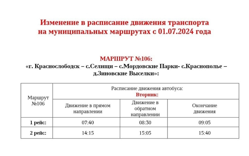 С предупреждением к жителям и гостям Краснослободского района Мордовии обратились представители местных властей. В администрации сообщили, что с 1 июля изменится график движения автобуса №106, который курсирует по маршруту “Краснослободск — Селищи — Мордвские Парки — Краснополье — Зиновские Выселки”.
