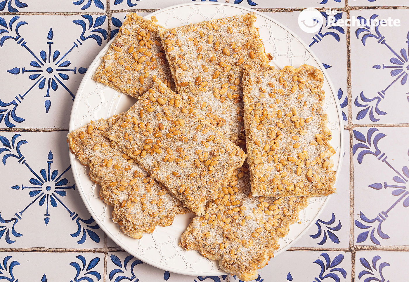 - Repartimos los chicharrones sobre la masa, presionando con la mano para que queden mejor adheridos a la masa. Escurrimos los piñones y los repartimos por la superficie. Opcionalmente podemos dar forma de puntilla a los bordes de la masa para decorar, para hacerlo podemos empujar la masa hacia adentro con un cuchillo redondo en plano cada 1cm.