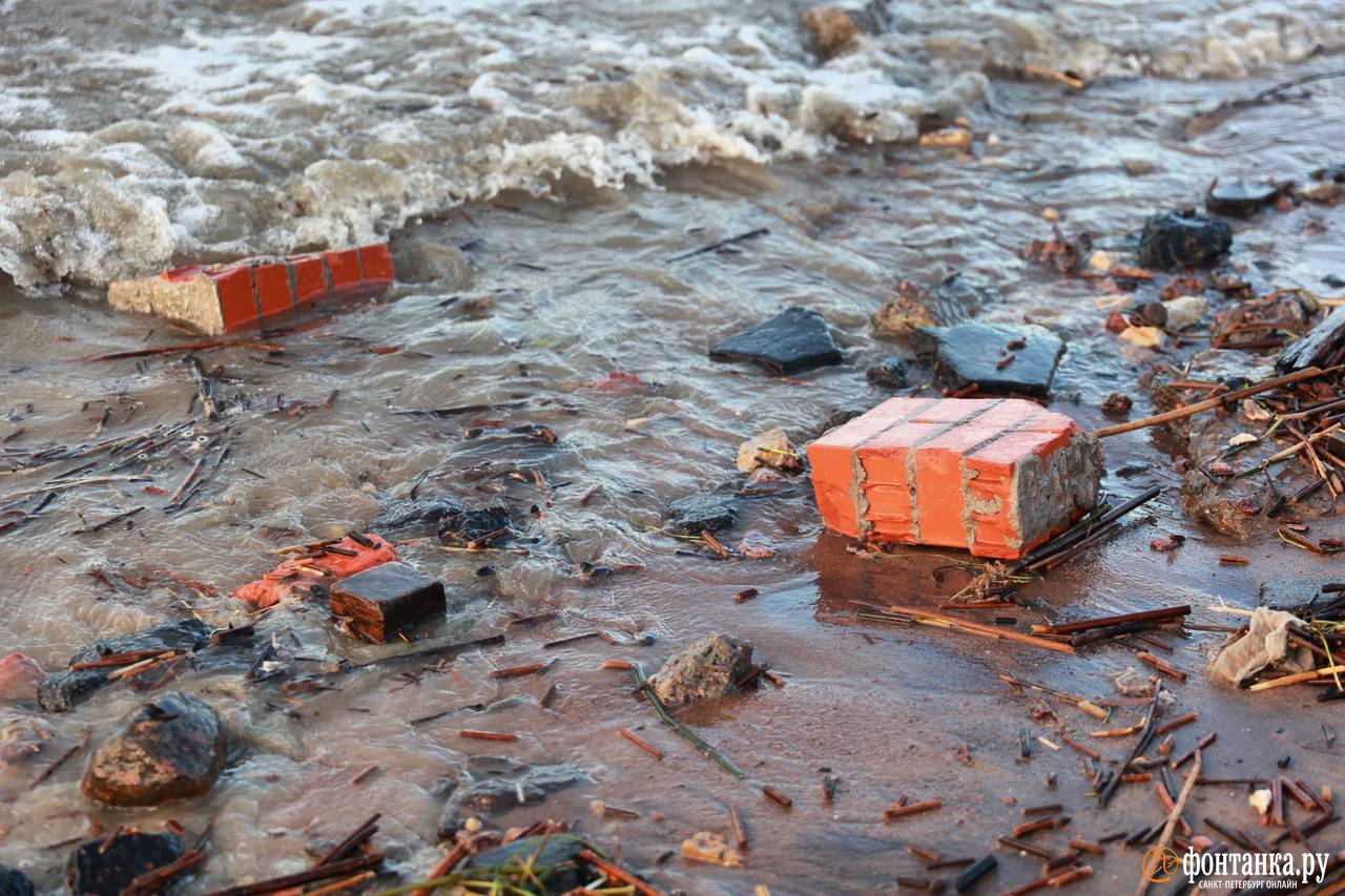 Утром 15 октября десятки метров береговой линии усеяны обломками строительного мусора и арматуры. Местами на песок выбросило огромные куски бордюрного камня, фрагменты кирпичной кладки и тротуарную плитку. И это не говоря уже о корягах, торчащих из песка у кромки воды.