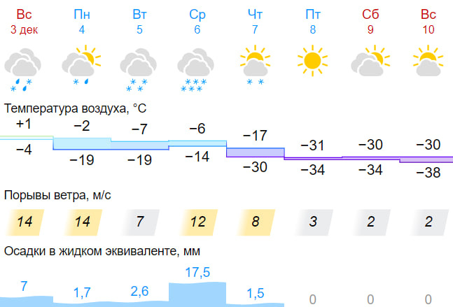 World-weather прогнозирует резкое похолодание 7 декабря, так температура ночью 6 декабря будет -2 градуса, а днем 7 декабря составит -23 градуса. С пятницы по воскресенье синоптики ожидают морозы, ночью температура может опуститься до -32 градусов. При этом снегопады продлятся три дня со вторника по четверг.