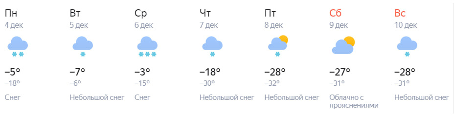 По данным «Яндекс.Погоды», температура днем в начале недели составит -5 градусов, но в эту же ночь опустится до -18 градусов. Синоптики ожидают резкое изменение температуры с -3 градусов днем в среду до -18 градусов днем в четверг. При этом в конце недели температура может опуститься до -31 градуса, выходные также должны быть морозными. Кроме того, синоптики прогнозируют снег с понедельника по пятницу, в субботу будет без осадков, а в воскресенье снова пойдет снег.
