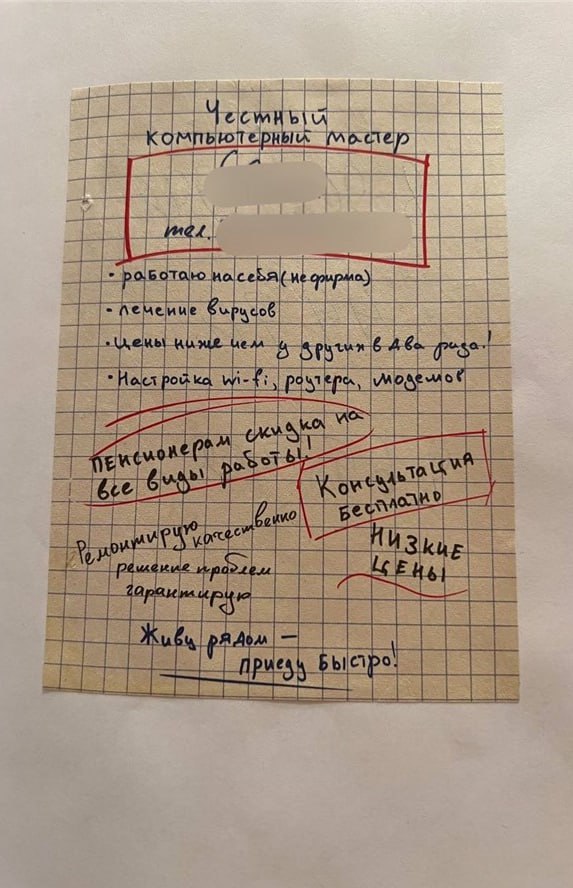 Объявление домушника женщина нашла в почтовом ящике — её подкупило, что мужик делал скидки пенсионерам. Мастер пришел по вызову и взял за ленивую чистку убитого компа 865 тысяч. Самое главное — женщина растерялась и отдала ему всю сумму, даже пришлось занимать у сына. Реальная стоимость ремонта была ноль рублей. Мастера нашли, ему грозит до 6 лет тюрьмы. Деньги пенсионерке вернули.