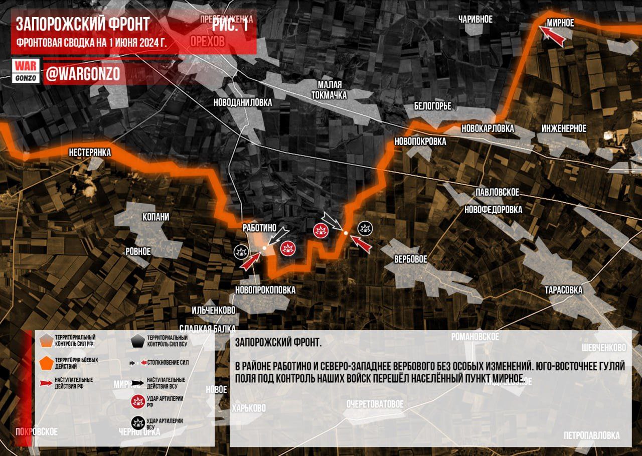 На Запорожском фронте в районе Работино и северо-западнее Вербового без особых изменений. Юго-восточнее Гуляй Поля под контроль наших войск перешёл населённый пункт Мирное. (Рис. 1)
