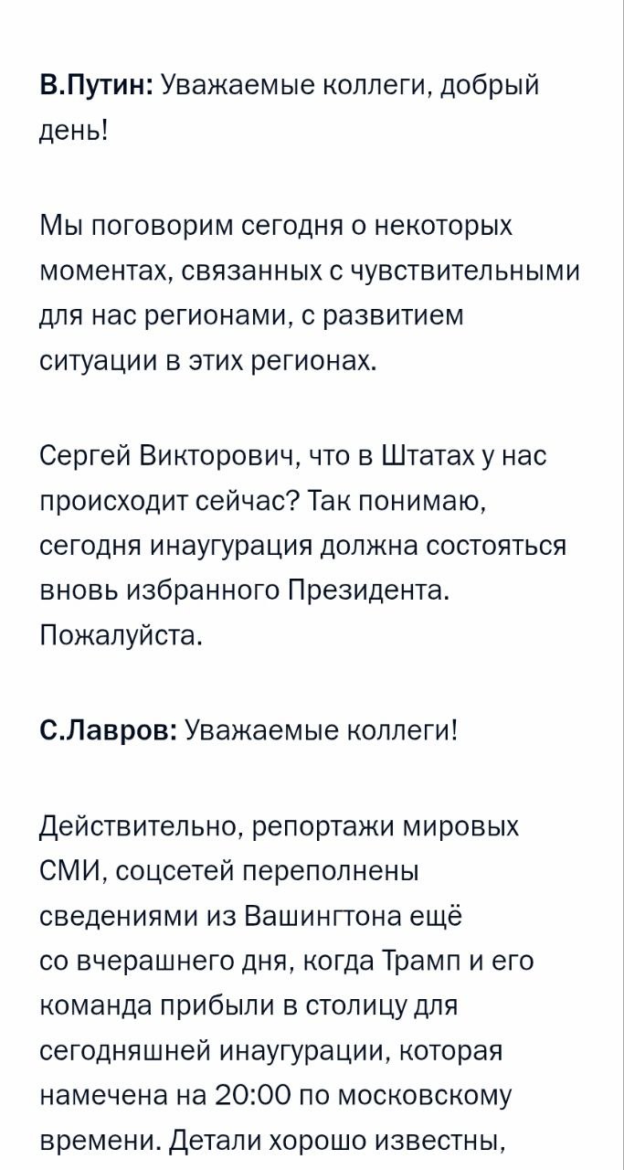 Самое интересное в путинском поздравлении Трампу СМИ и не заметили. А именно, вопрос нашего президента главе МИД РФ: «Сергей Викторович, что в Штатах у н а с происходит сейчас? Так понимаю, сегодня инаугурация должна состояться вновь избранного Президента. Пожалуйста.»