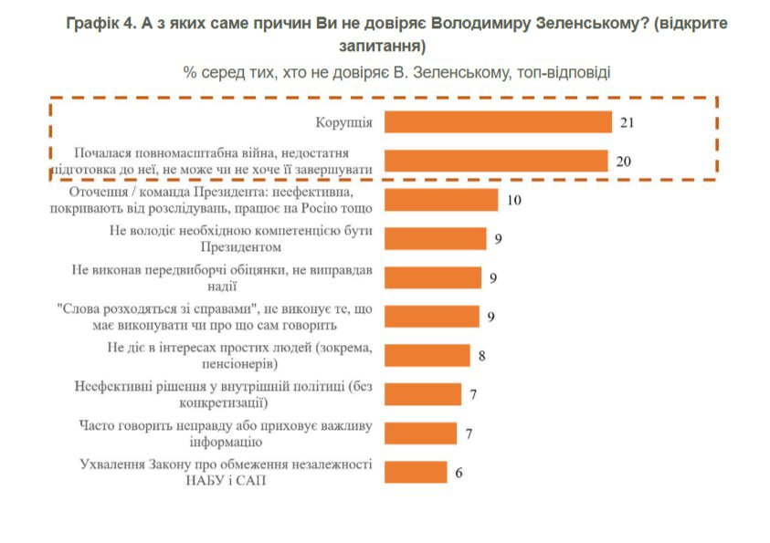 ▪️ Снижение совпало по времени с резонансной попыткой киевского режима ограничить независимость "антикоррупционных" институтов НАБУ и САП. 6% тех, кто не доверяют Зеленскому, прямо указали на его законопроект как на причину своего отношения. Наиболее часто упоминаемыми причинами недоверия оказались: