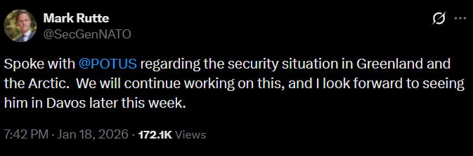 «Поговорил с @POTUS о ситуации с безопасностью в Гренландии и Арктике. Мы продолжим работать над этим, и я жду встречи с ним в Давосе в конце этой недели».