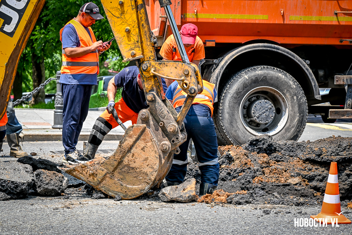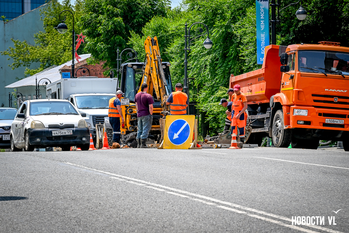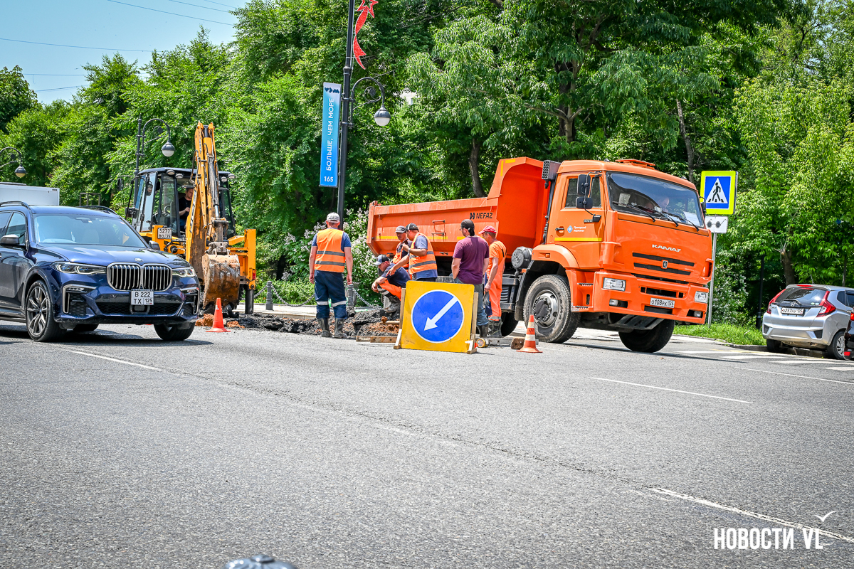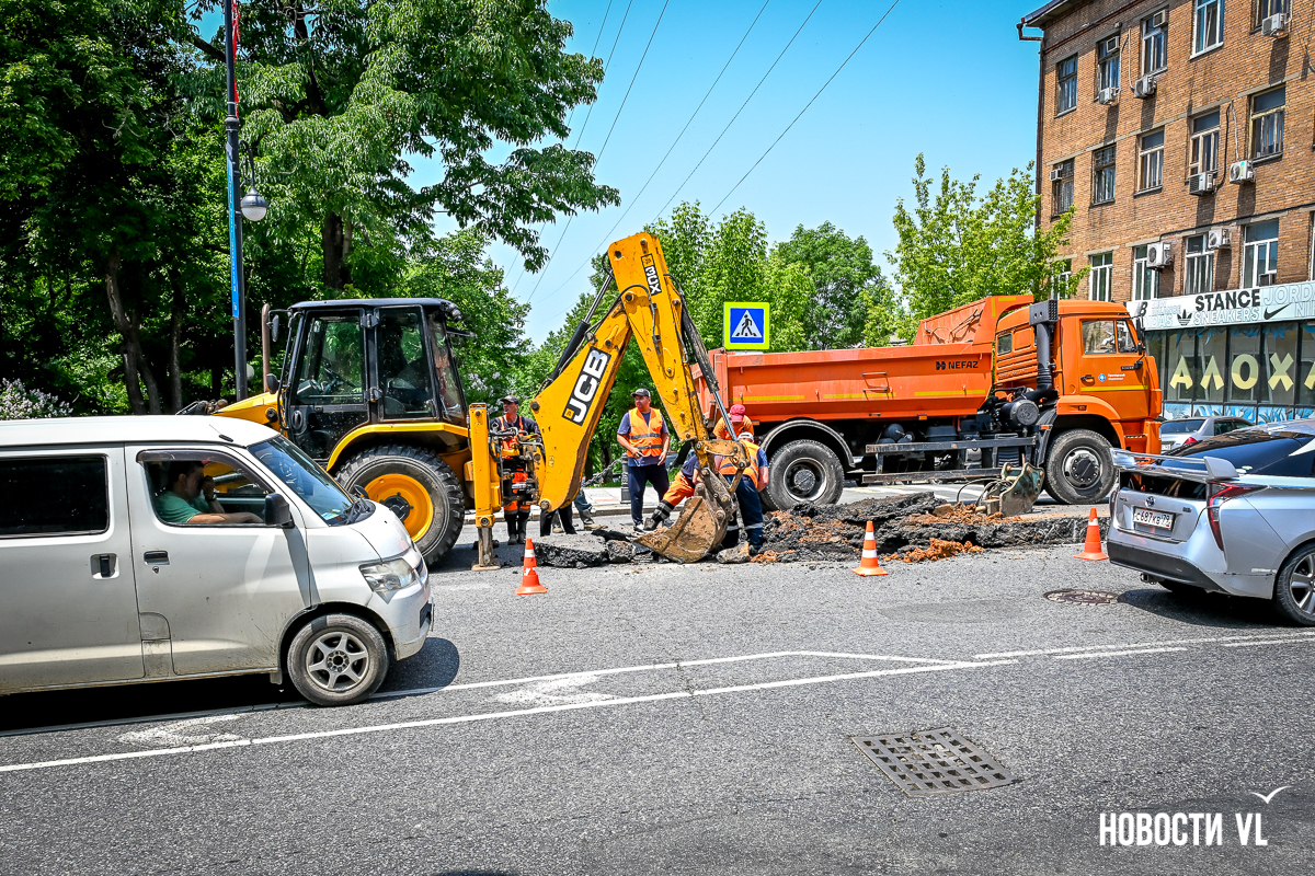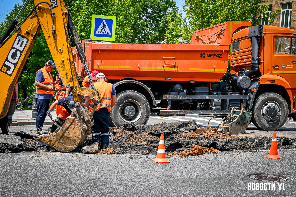 Примводоканал раскопал участок автомобильной дороги на перекрёстке Океанского проспекта и Прапорщика Комарова для ремонта трубы. Перекрытыми оказались две полосы в сторону Покровского парка, в течение дня здесь движение осложнено. На данный момент основные работы уже завершились, а пробка всё ещё есть – привести дорогу в первоначальный вид обещают на следующей неделе.