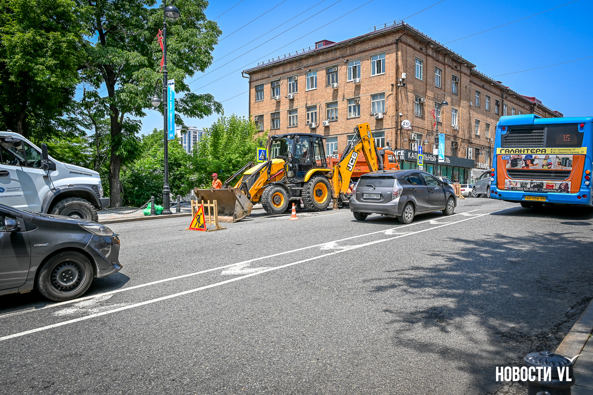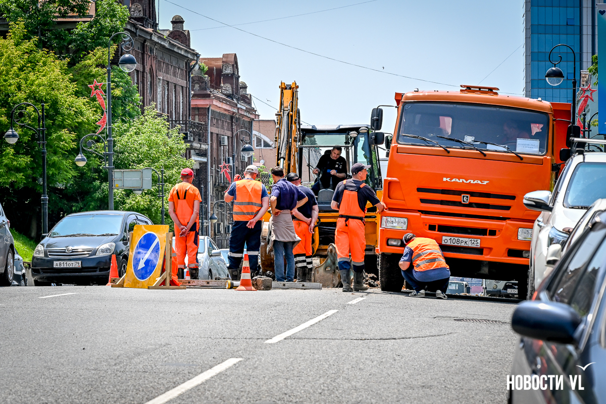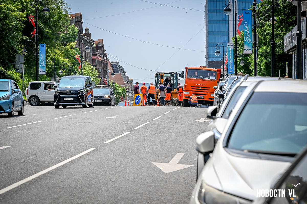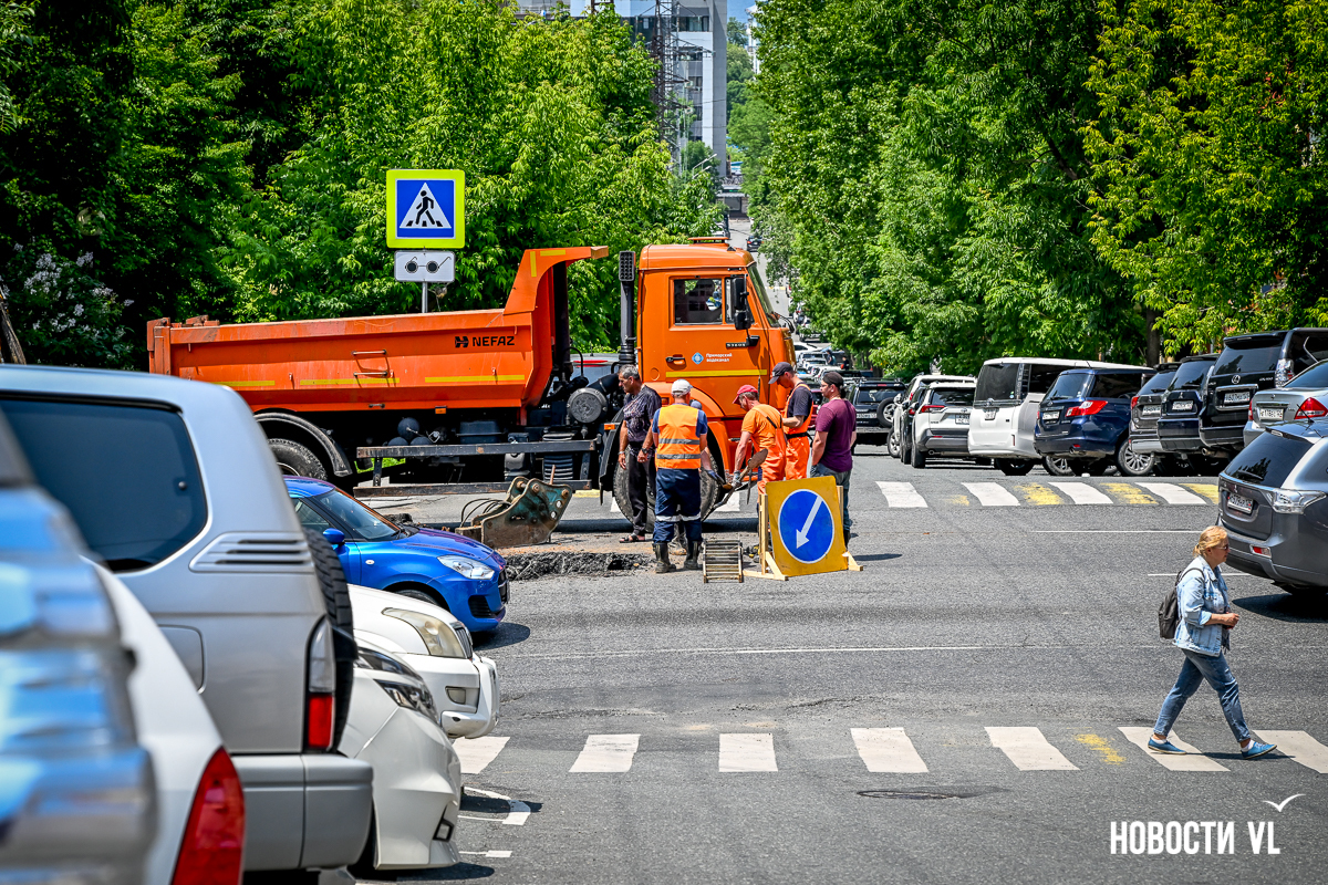 Примводоканал раскопал участок автомобильной дороги на перекрёстке Океанского проспекта и Прапорщика Комарова для ремонта трубы. Перекрытыми оказались две полосы в сторону Покровского парка, в течение дня здесь движение осложнено. На данный момент основные работы уже завершились, а пробка всё ещё есть – привести дорогу в первоначальный вид обещают на следующей неделе.