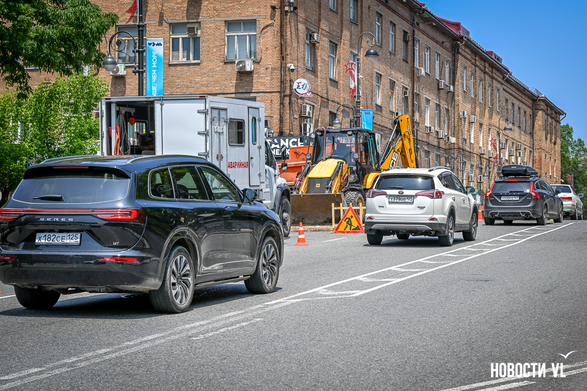 Раскопки велись рядом со сквером Почётных граждан, на второй полосе. На первой разместилась техника Примводоканала. В обед здесь уже была пробка – специалисты вскрывали асфальт, чтобы подобраться к протекающей трубе диаметром 600 миллиметров. А ближе к концу рабочего дня в пресс-службе Примводоканала сообщили, что работы завершены – течь устранена.