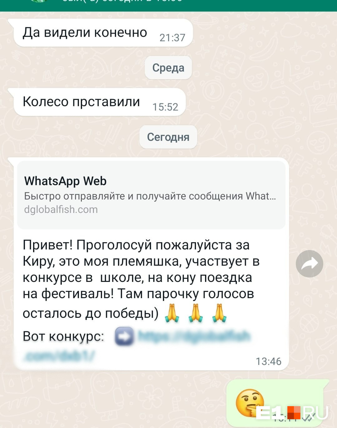 — Я чуть не нажал на ссылку, но подобное было месяц назад с моей знакомой. Ей также пришла от родственницы ссылка проголосовать за племяшку... И я сегодня уже был готов, но написал товарищу СМС: «А у тебя разве есть племяшка?». Тут же получил ответ: «Не проходи по ссылке, у меня WhatsApp взломали», — рассказал читатель E1.RU.
