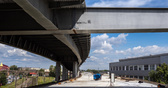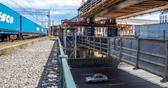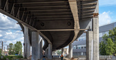 «Фонтанка» писала, что к этому решению пришли уже после начала проекта. Дело в том, что если где и есть по-настоящему стесненные условия, то именно здесь: строить надо между железной дорогой и производственными зданиями. В итоге через Московский проспект трасса прыгает двумя ярусами в двух шагах от железнодорожного моста. Для того, чтобы смонтировать этот пролет, предварительно собирали кран-гигант, способный поднимать до 750 тонн. «Его завозили на площадку неделю только, фермы стрелы отдельно, гусеницы отдельно и т.д., — рассказывает Иван Резников, главный специалист СОТТБиЭ. — Таких кранов на Северо-Западе всего два. И потом он с одной стороны Московского и с другой монтировал главное пролетное строение. Смонтировал — разобрали».