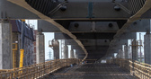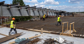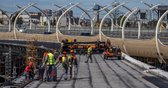 Сейчас здесь не достает буквально одного сегмента к востоку от Московского проспекта, металлоконструкции к нему подвозят. На обоих ярусах укладывают арматуру, повсюду барханчики песка — весь металл перед монтажом проходит пескоструйную обработку.