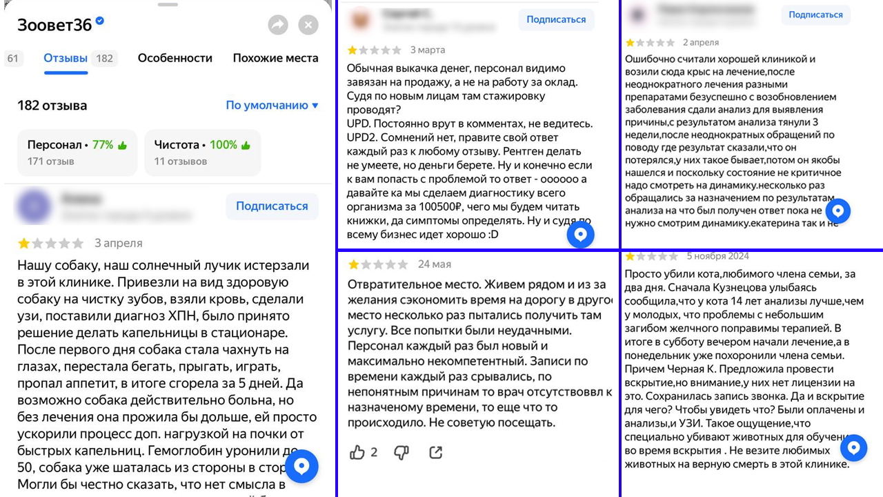 При этом в интернете можно найти массу плохих отзывов на сотрудников «Зоовет36». Многие жалуются на халатность ветеринаров. Приводим некоторые из них:
