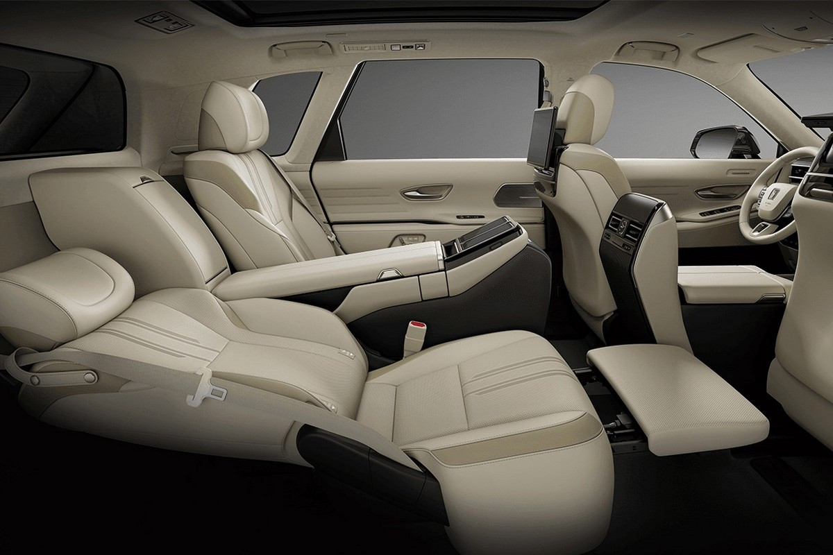 Для «поднебесной» модели пока заявлена единственная комплектация с четырехместным салоном. Между задними креслами размещен массивный тоннель со складным столиком, опциональным холодильном между спинками и отдельными пультами для управления основными функциями. Сами сиденья – с выдвижными подставками для ног, подогревом, вентиляцией и массажером.