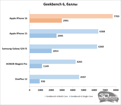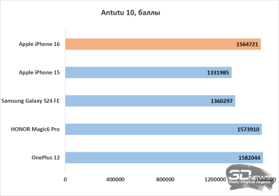 iPhone 16 стал значительно производительнее iPhone 15. Сама Apple заявляет, что центральный процессор стал быстрее на 30 %, а графический — до 40 %. И синтетические тесты в целом подтверждают эти заявления. В Geekbench 6 и AnTuTu 10 виден значительный прирост производительности iPhone 16 по сравнению с предшественником. Если же сравнивать с Android-смартфонами, то в тестах Geekbench 6 смартфону Apple просто нет равных — даже флагманы на Snapdragon 8 Gen 3 заметно отстают. А вот в AnTuTu флагманы на Android способны на равных потягаться с iPhone 16.