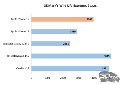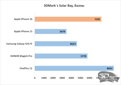 Что касается графической производительности, то тесты пакета 3DMark и GFXBench показывают ещё более значительный прирост производительности iPhone 16 относительно iPhone 15. Замечу, что в результатах GFXBench следует ориентироваться на тест Offscreen, поскольку при рендеринге экран iPhone упирается в лимит 60 FPS, установленный вертикальной синхронизацией. Если сравнивать с Android-смартфонами, то в плане графики iPhone 16 вполне в состоянии потягаться с актуальными флагманами, хотя отдельным моделям он и проигрывает.