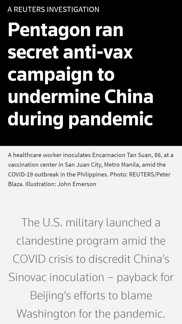 Пентагон проводил секретную "черную" PR-кампанию против вакцинации, чтобы подорвать позиции руководства Китая во время пандемии. Во время коронавируса военные из США запустили тайную программу по дискредитации китайской прививки Sinovac, пишет Reuters. Эксперты в области здравоохранения говорят, что это решение подвергло риску жизни невинных людей. https://t.me/banksta/53693