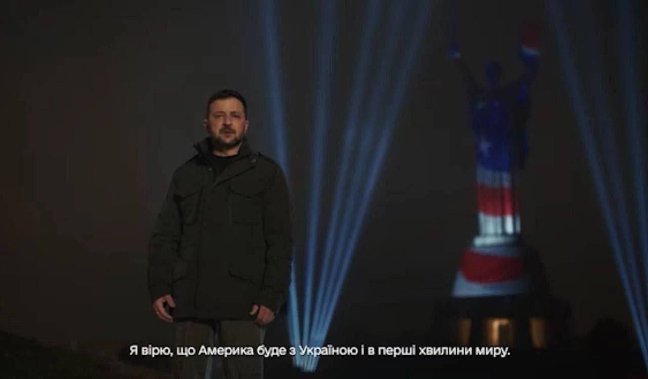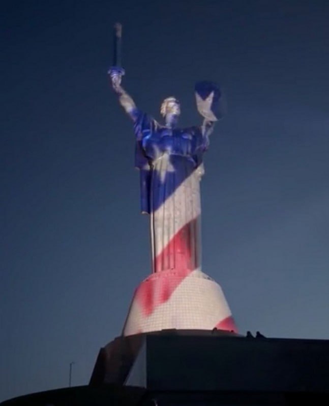 Во время новогоднего обращения Зеленского советский памятник «Родина-мать» в Киеве вновь окрасили в цвета флага США.