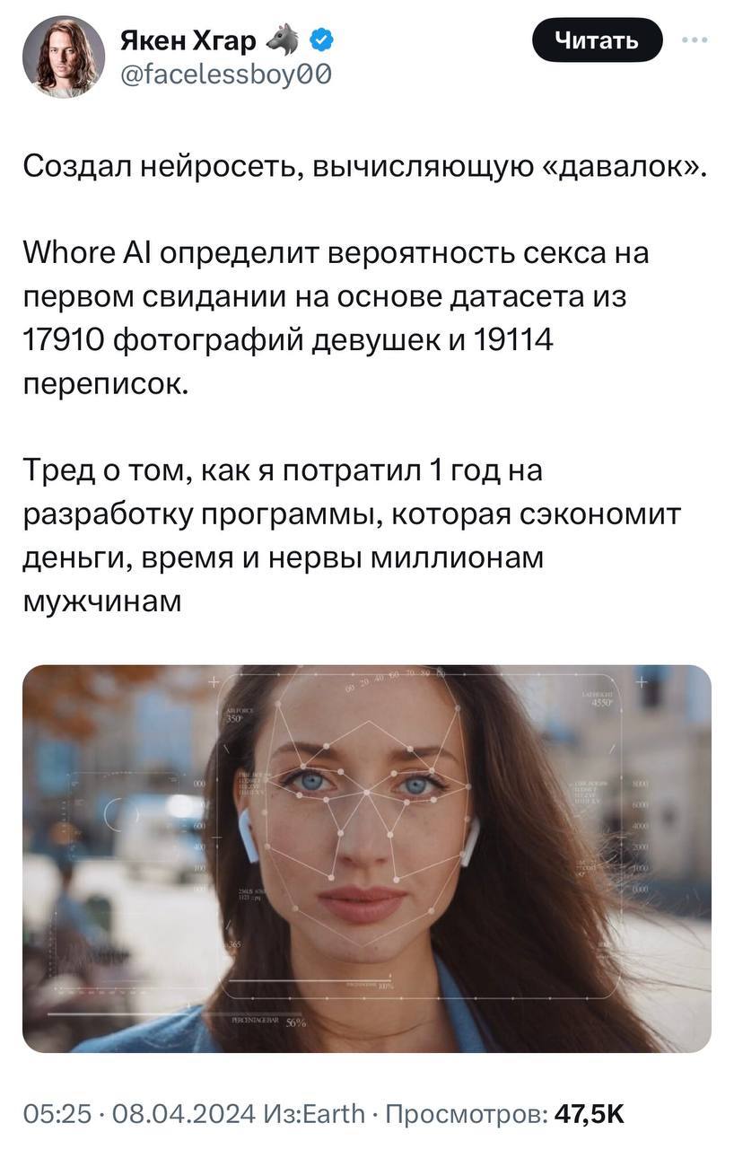 Хвиттерский создал нейросеть, которая по фотографиям девушек вычисляет "вероятность секса на первом свидании". Для создания использовалось 17,910 фотографий и 19,114 переписок парней с девушками.