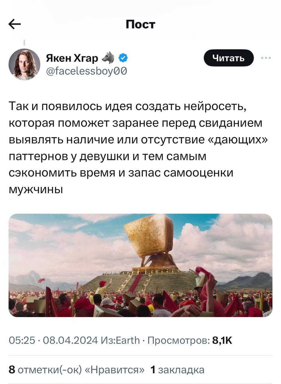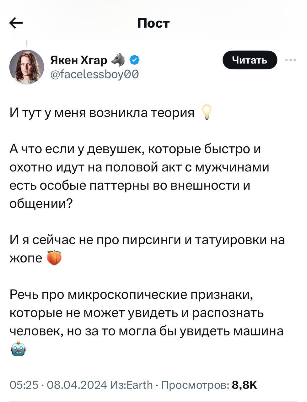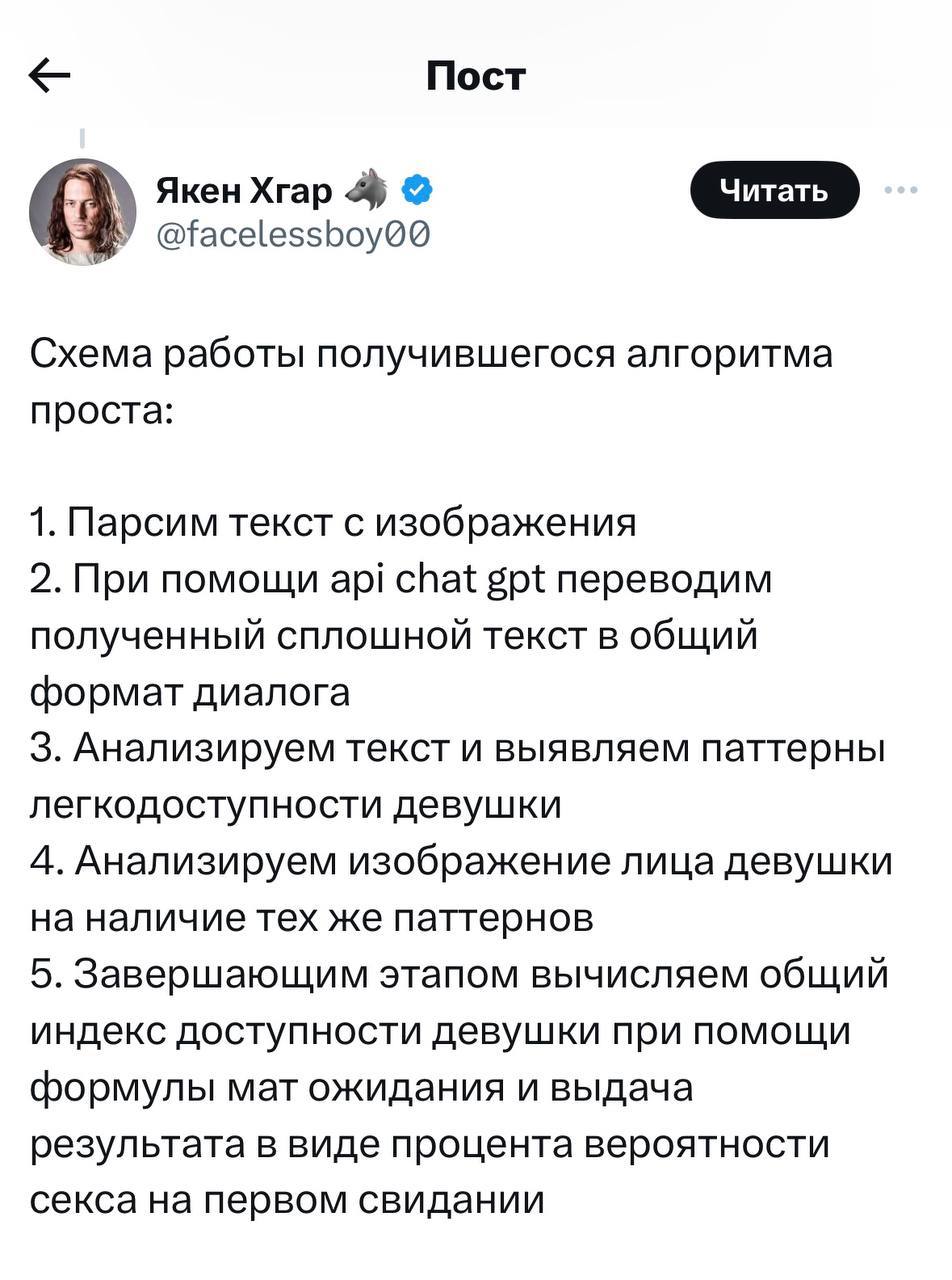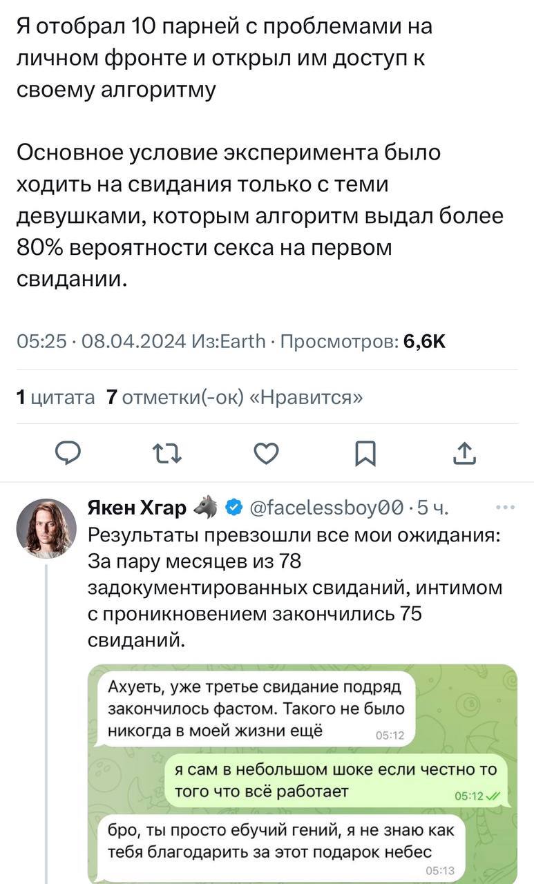 По его словам, после того, как он открыл доступ к нейронке для 10 парней, то за пару месяцев 75 из 78 свиданий закончились сексом.