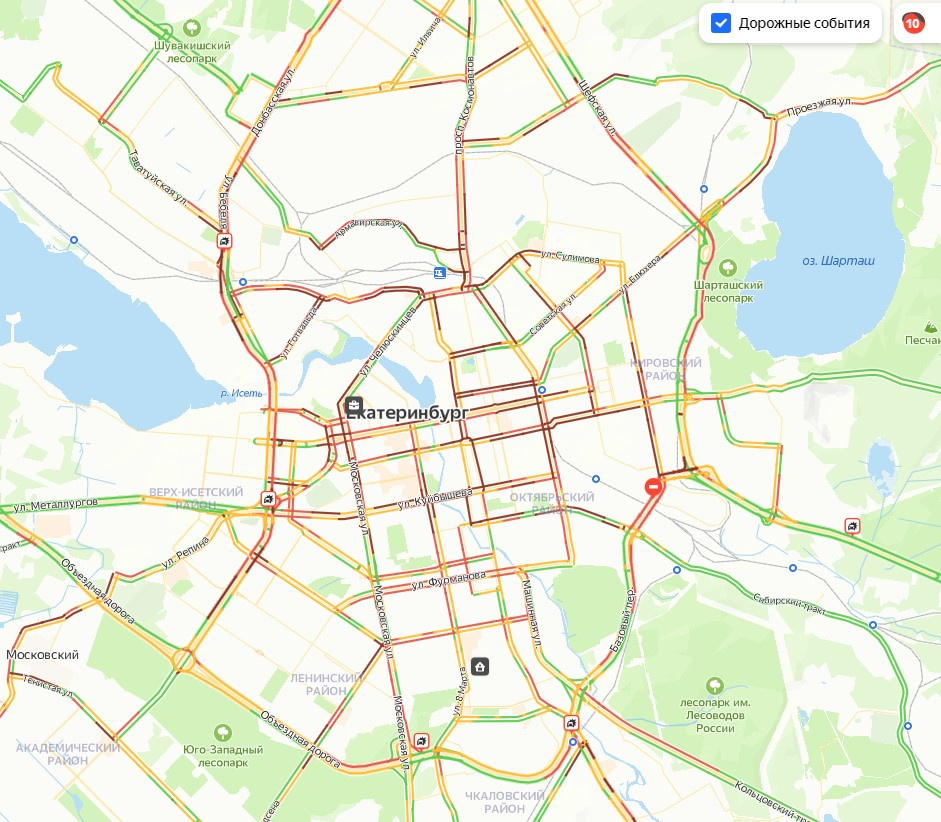 Вечером 21 ноября Екатеринбург встал в 10-балльные пробки. Самая напряженная ситуация в центре города. На дорогах, судя по «Яндекс.Картам», уже четыре аварии в разных районах.