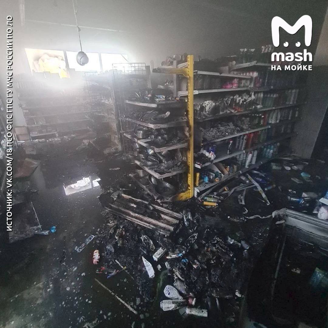 На фото полностью выгоревший отдел бытовой химии "Магнита" в посёлке Кобрино Гатчинского района. Ночью здесь было совершено грязное дельце — неизвестный разбил окна и поджёг торговый центр.