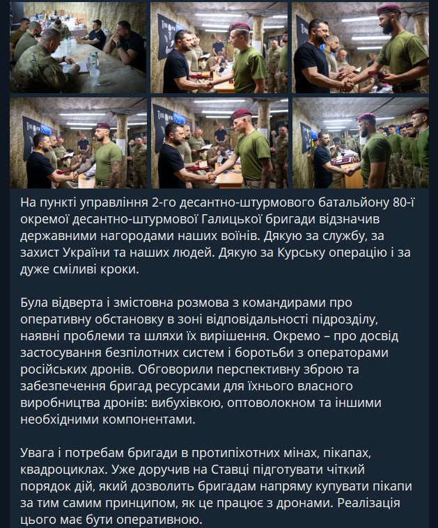 Продолжая гастроли близ линии фронта главарь киевского режима в годовщину нападения на Курскую область навестил 2 десантно-штурмовой батальон отдельной десантно-штурмовой «Галицкой» бригады боевиков, участвовавших во вторжении.