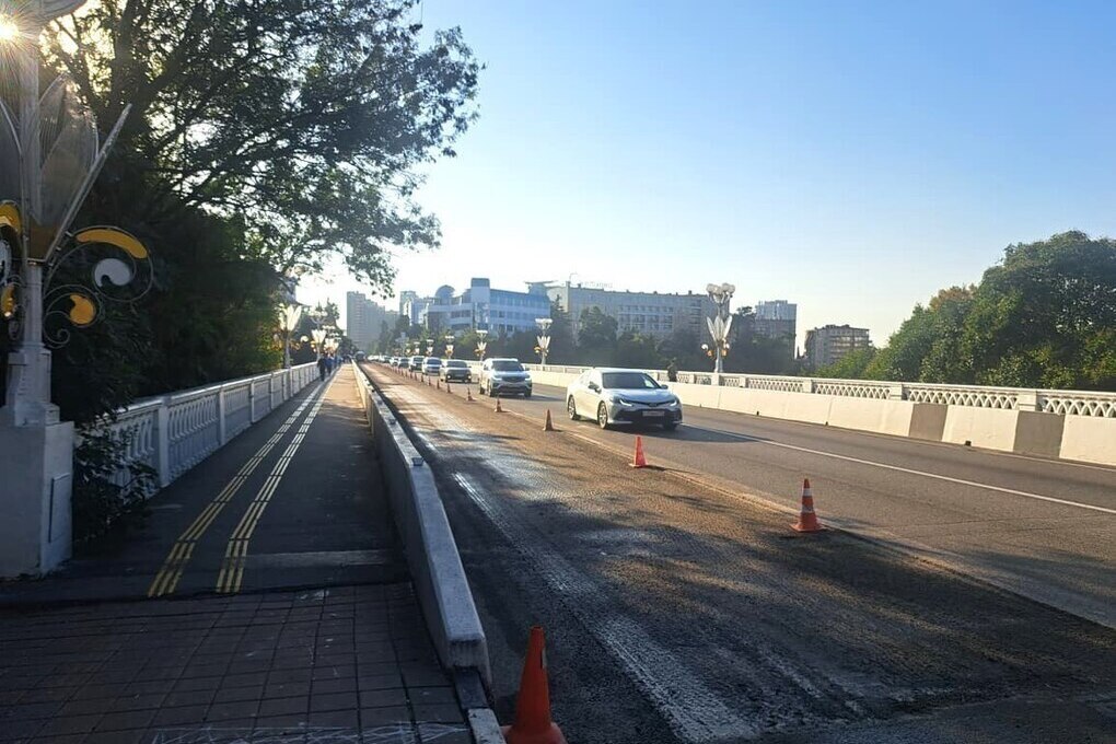 В районе моста на Курортном проспекте в Сочи, расположенном между остановками "Театральная" и "Светлана", ведутся дорожные работы. По данным городской мэрии, общая площадь ремонтируемого участка составляет около 2 700 "квадратов".