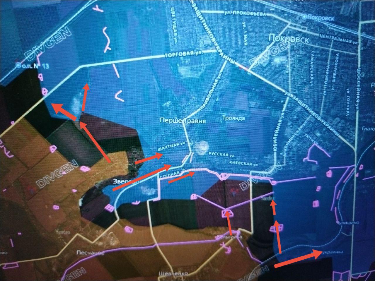 В Котлино — встречные бои в северо-западной части. Наши штурмовые группы атакуют противника в посадках в направлении Гришино и западной окраины Покровска (Красноармейска). Есть продвижение в районе свалки.