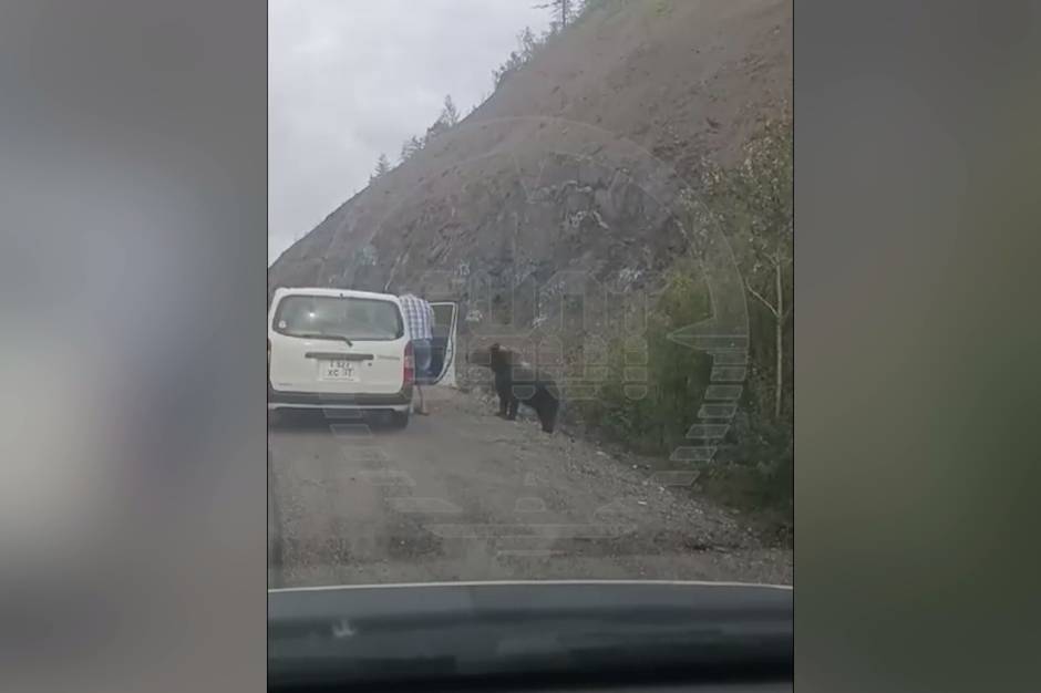 В Хабаровском крае мужчина покормил медведя на обочине автомобильной трассы. Видео © t.me / SHOT