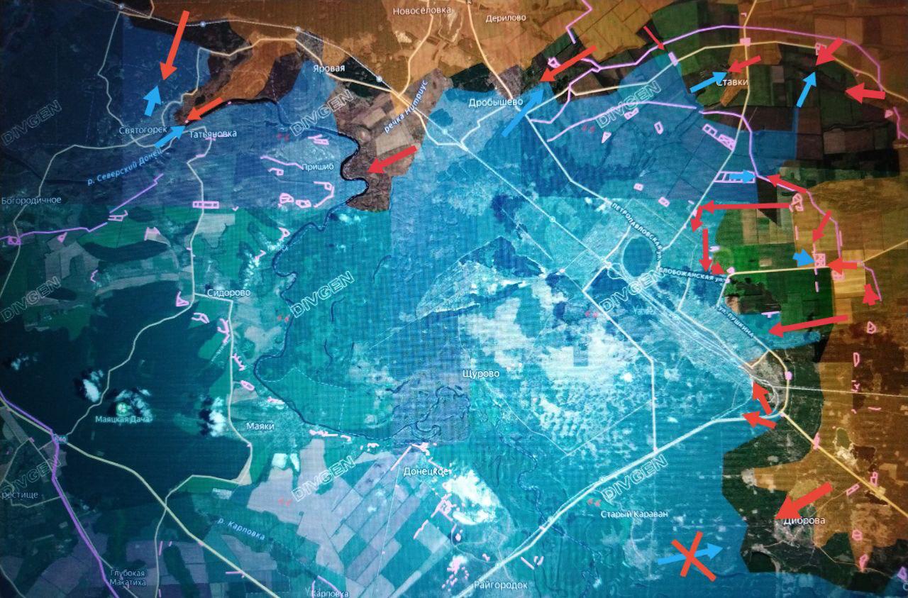Бои за Яровую, где наши штурмовые группы закрепились в западной и восточной частях, а также Сосновое. Между этими населёнными пунктами наши подразделения продвинулись в лесной зоне к северной окраине Святогорска и ведут бои за оздоровительный комплекс "Перлына (ДОЦ "Красная гвоздика").