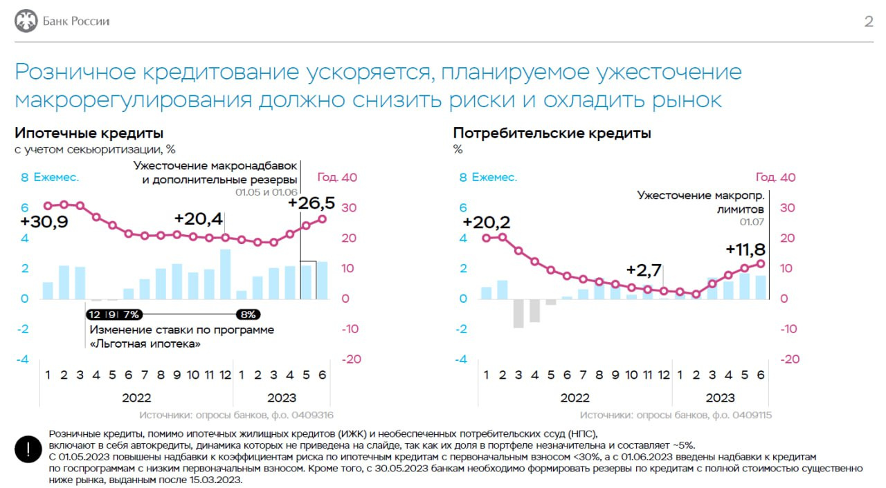 Текущие ежемесячные темпы роста в потребкредитовании ЦБ тоже считает довольно высокими. Если так будет продолжаться дальше, это станет поводом для беспокойства и, возможно, дальнейшего регулирования. А пока рецепт для ограничения необеспеченных потребкредитов один — повышение макропруденциальных лимитов. Новые, более жесткие требования как раз начали действовать с 1 июля. При необходимости их могут скорректировать.