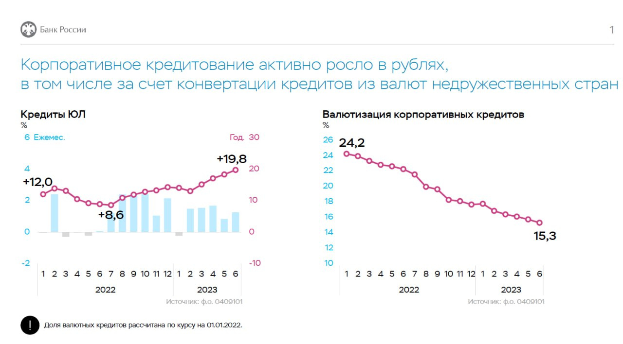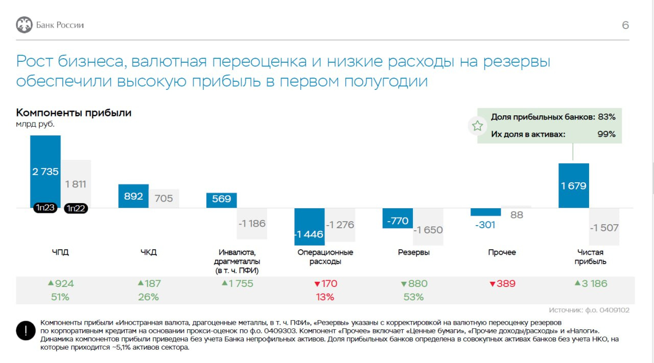 Вторая причина, по которой банки в первой половине 2023 года заработали больше, чем ожидалось, — валютная переоценка. Слабый рубль оказался вполне себе выгоден банковскому сектору и за шесть месяцев совокупно принес 569 млрд рублей прибыли, а вот в прошлом году в том числе на колебании курса они получили 1,2 трлн рублей убытка. На фоне этого продолжается девалютизация кредитов и депозитов компаний и граждан. Отвечая на вопросы журналистов, Данилов выразил мнение, что этот процесс будет продолжаться дальше, но вряд ли уже такими существенными темпами, как ранее.