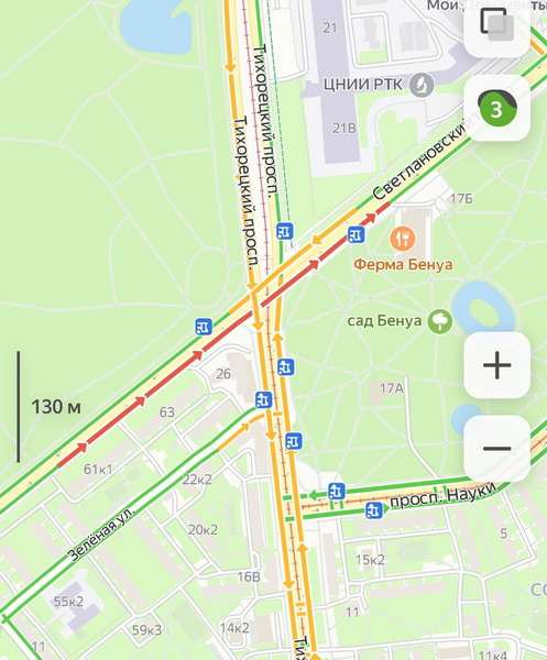 Судя по данным сервиса «Яндекс.пробки», на участке образовался «красный» затор. Особенно движение затруднено по Светлановскому проспекту, трамваи встали.