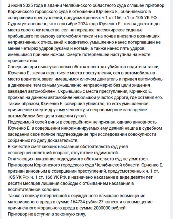Коркинский горсуд признал задержанного виновным в убийстве женщины. Ему назначено наказание в виде 9 лет 10 месяцев лишения свободы в воспитательной колонии. Кроме этого с семьи осуждённого взыскали 2 миллиона рублей в качестве компенсации морального вреда и 164 тысячи рублей в качестве компенсации материального вреда. Имущество родителей Юрченко арестуют до выплаты компенсации.