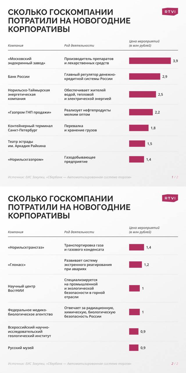 ❗️Российские госкомпании практически перестали публиковать закупки на проведение новогодних корпоративов, однако RTVI удалось найти на сайтах госзакупок мероприятия на десятки миллионов рублей.