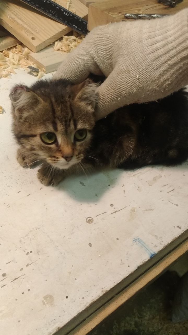 Найден в −18 вечером рядом с мастерской. Ночь скорее всего была бы последней. Прятаться негде. Из потерь от мороза по итогу только уши.