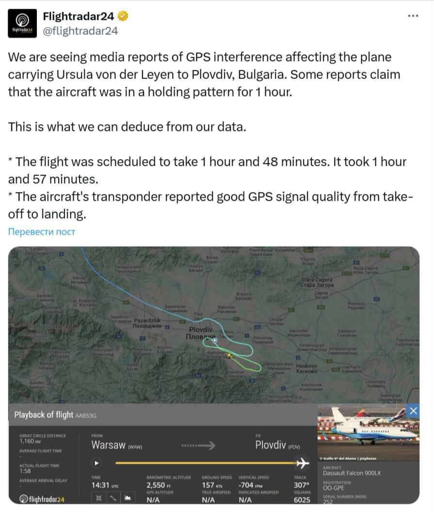Flightradar24, напомним, опроверг слова главы ЕК и подчеркнул, что никаких проблем в работе GPS у самолёта фон дер Ляйен не было.