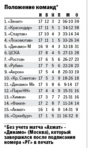 Добавим, что накануне, уже после подписания номера "РГ" в печать, состоялся заключительный матч 17-го тура между "Ахматом" и "Динамо". Ну а в последнем туре в уходящем году на выходных пройдут следующие игры: "Спартак" - "Пари НН", "Ростов" - "Крылья Советов", "Зенит" - "Акрон", "Краснодар" - "Локомотив", "Динамо" (Москва) - "Химки", "Факел" - ЦСКА, "Динамо" (Махачкала) - "Рубин", "Ахмат" - "Оренбург".