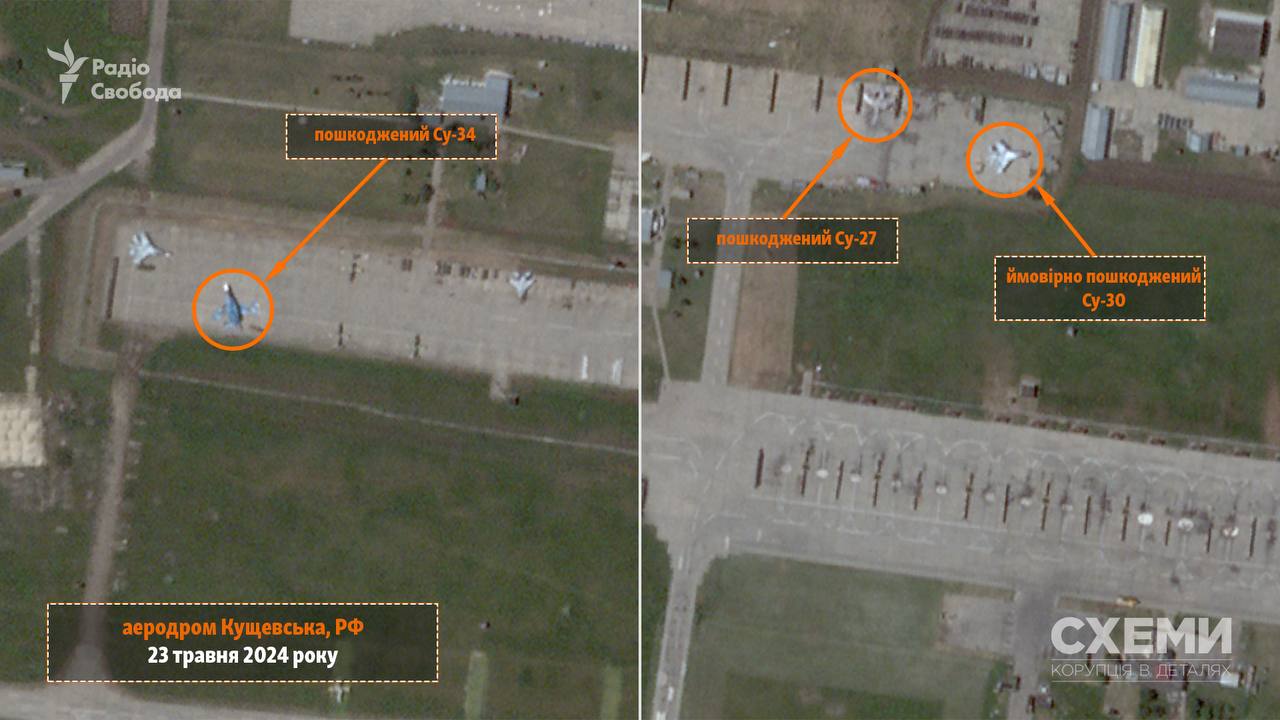 На изображениях от 23 мая видны повреждения по меньшей мере двух истребителей — Су-27 и Су-34. Также мог пострадать и Су-30, который находился рядом с поврежденным Су-27.